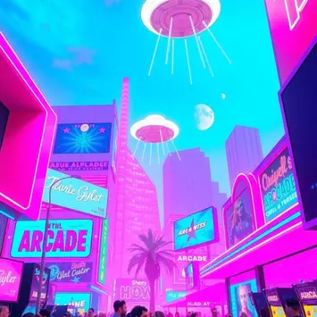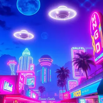 Take a walk through a world where synth beats light up the night and alien crafts cruise casually overhead. This isn’t your average retro-future — it’s Synthwaves, a digital postcard from an alternate 1980s where everyone’s chill about the UFOs and neon reigns supreme.